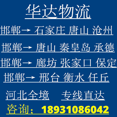 邯鄲到保定物流公司 |邯鄲物流公司 華達物流 電話0310-5510646手機18931086042專業提供邯鄲到保定物流專線運輸、整車運輸、零擔運輸、大件運輸、長途搬家以及易碎物品整理裝箱、家具電器拆卸打包等服務。10年物流運輸經驗,保證客戶零風險,一站式綜合邯鄲到保定物流服務,您值得信賴!