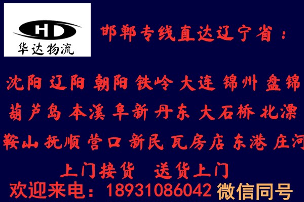 邯鄲到遼陽物流公司 |邯鄲物流公司 華達物流 電話0310-5510646手機18931086042專業提供邯鄲到遼陽物流專線運輸、整車運輸、零擔運輸、大件運輸、長途搬家以及易碎物品整理裝箱、家具電器拆卸打包等服務。10年物流運輸經驗,保證客戶零風險,一站式綜合邯鄲到遼陽物流服務,您值得信賴!